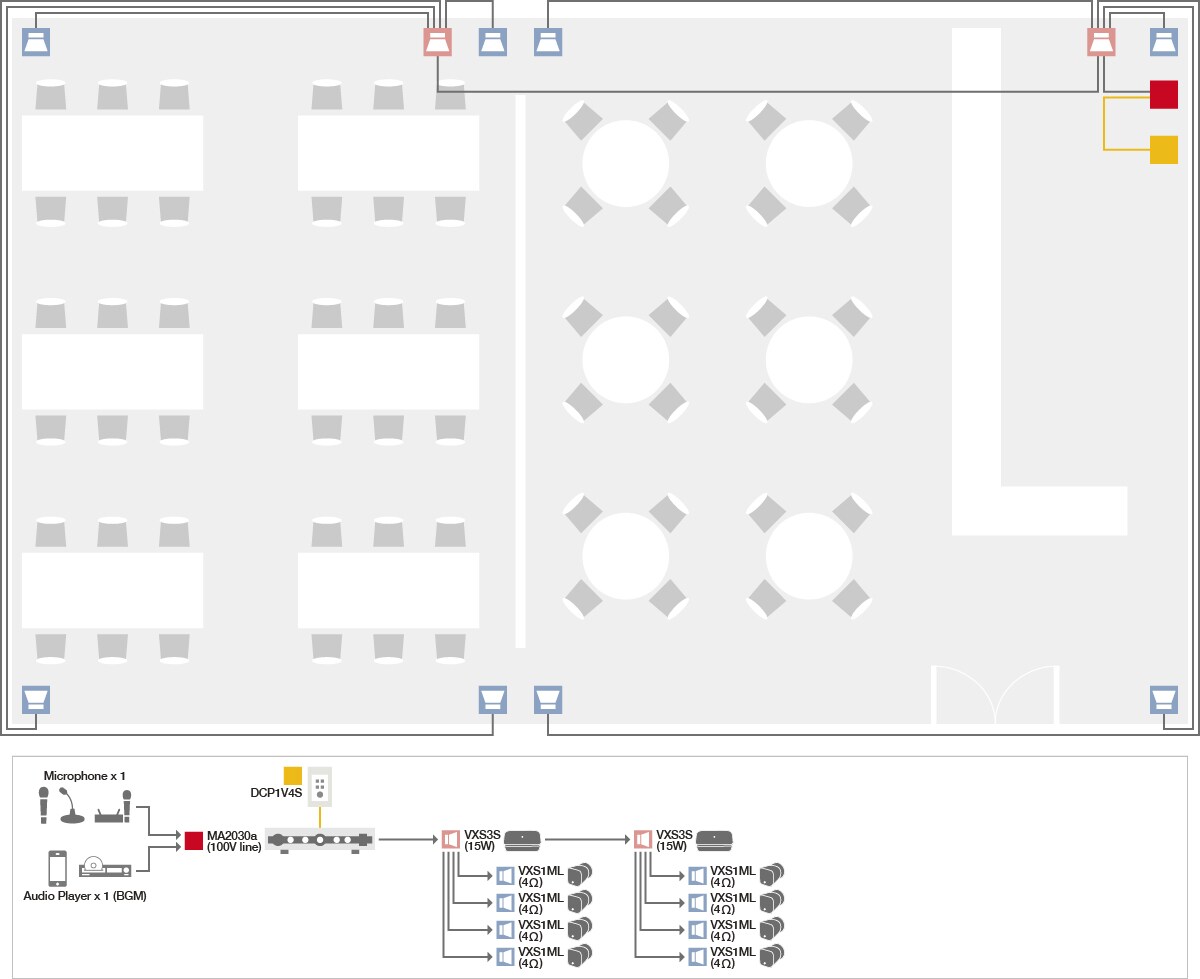 這是以高阻抗連接VXS3S並建構多個衛星喇叭的系統。您可以透過點擊切換輸出瓦數來輕鬆更改所需的音量。 MA2120可以在不同的區域提供不同的音源。