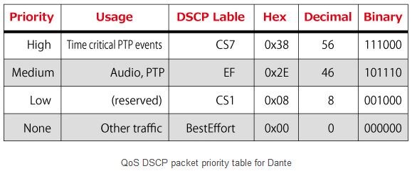 Dante 所推薦的 QoS 設定列在 Audinate 網站上。