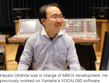 本篇報導中首位與我們交談的是負責 MBC4 開發的研究人員 Hayato Ohshita 先生。就讀大學時,Ohshita 先生就涉足可區分樂器音、自動轉錄音樂等研發技術的研究。加入 Yamaha 後,他加入 VOCALOID 研發部門,並自 2010 年起成為 K's Lab 團隊的一員。Ohshita 先生於 2013 年開始著手於 MBC4 的研究。