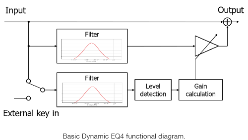如下圖所示,能涵蓋四個頻寬的等化器Dynamic EQ4 將輸入訊號分配到兩個濾波器,其中一個輸入偵測器和控制剩餘濾波器增益的 EQ 增益計算器。此配置的主要優勢是,可針對非常窄的頻寬進行控制。Ishizuka 先生展示等化器的不尋常使用方式,讓我們倍感驚豔。