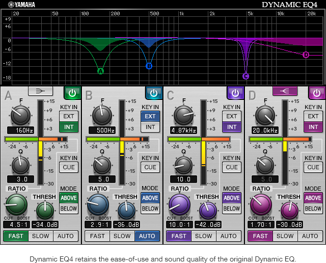 如 Ishizuka 先生所述,使用涵蓋四頻寬的等化器Dynamic EQ4用來控制重疊頻率時,似乎可發揮側鏈效應的作用。每個頻寬均提供 ABOVE 和 BELOW 模式開關,這些開關可搭配 RATIO 控件使用,以在超過特定頻寬時提升層級,與閥門操作類似,僅在達到預設值時才允許訊號通過,另外也與壓縮器的操作類似,在超過設定的頻寬等級時會被降低層級。