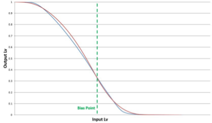 該圖顯示真空管擴大機模型開始失真的關鍵點。藍線代表以前的真空管擴大機型號,紅線代表新的 THR 型號。