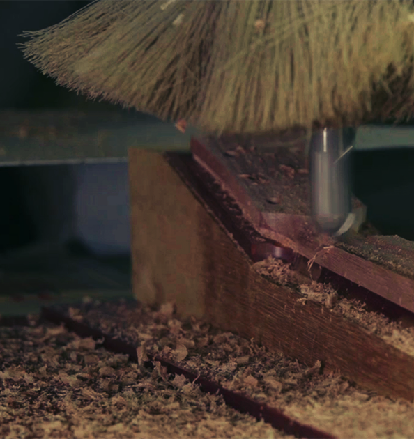 Carving the bracing requires extreme skill and sensitivity from an experienced guitar builder. Chisels are used to shape the bracing, and then the craftsman taps it to check its sound. This task is repeated with painstaking care to produce the perfect bracing shape.