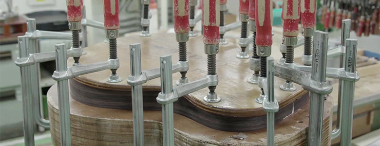 Because attaching the bridge in the perfect position is crucial to an acoustic guitar’s sound and playability, a special tool is used to keep clamping strength at a fixed level and ensure that there is no movement or variation.