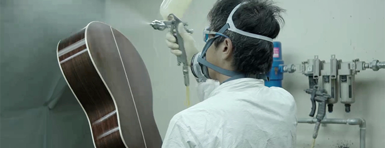 During coating, a film approximately 10 microns (0.01mm) thick is applied precisely with each spraying. Each coating is applied in a layer that is not too thin, nor too thick, to avoid beading of the paint. The finishes used are developed in a joint effort between Yamaha’s in-house research divisions and finish manufacturers, with an emphasis on sound, ease of application, and the ability to cope with changes in the guitar’s environment.