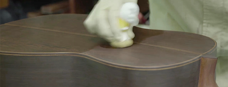 A range of different abrasive compounds and buffing cloths are used to buff the guitar to a brilliant shine. Different finish types result in coatings of differing hardness, so it is necessary to take measures such as altering the RPM of the buffing machine or reduce the strength with which it is applied to get a perfect finish.