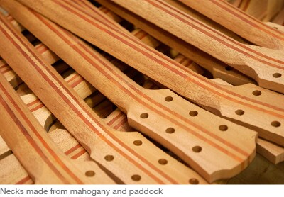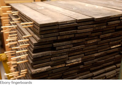 適合用來製作吉他琴頸的木材是堅韌的軟性木材。圖中有兩條紅線延伸下來的琴頸,是由桃花心木所製成,並貼上磚紅色的補強條來進行強化。指板會受到磨損與拉扯,所以使用具有高密度與強度的黑檀木製作。黑檀木也是製作琴橋的理想材料。