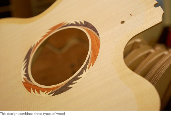 下圖是吉他的音孔區域。吉他的音孔周圍通常會有各式的裝飾設計。有許多不同的方式可創造這些設計。在這個例子中是使用雷射切割出三種不同的平板,然後將其鑲嵌進去。在此棕梠樹設計中,紅色與深棕色分別代表黃昏與夜間的沙灘。