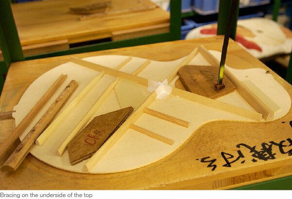 一旦完成裝飾,就將力木膠合到面板的內側。下圖顯示橫跨在音孔下方的音樑支柱正在調整角度。總共排放了八根音樑支柱。