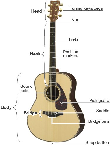 吉他由兩部分組成:琴頸與琴身。琴弦從琴頸延伸到琴身。當撥動琴弦時,其振動會從琴橋傳出,在吉他面板產生共鳴。 振動也會傳送到吉他的側板與背板,在琴身的空氣中產生共鳴,最後從音孔發出聲音。