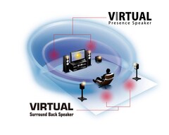 虛擬臨場揚聲器功能讓中置及環繞揚聲器創造出虛擬臨場效果。就算在安裝條件有限的情況下,也能體驗CINEMA DSP 3D環繞音效。此擴大機也擁有後方環繞揚聲器功能,讓您可以在無後方環繞揚聲器的情況下,也能體驗來自後方的自然音調。