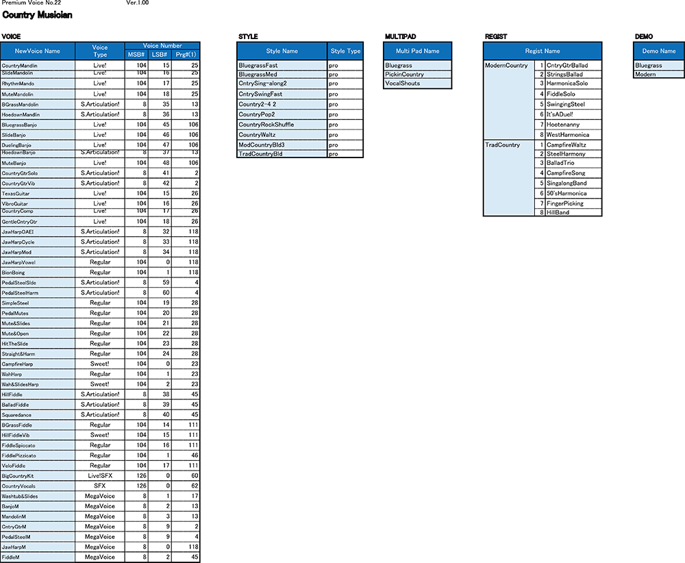 The Country Pack is an extensive collection of Voices, Styles, Multipads and Registrations suited for country music. This pack will fit the demands of any bluegrass, country, country-rock, folk and Americana performing musician.