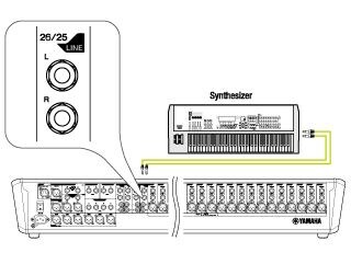 <鍵盤> 由於鍵盤具備立體聲輸出,因此使用 Phone 端子將鍵盤連接到立體聲道 25/26。如果改用 DI 連接鍵盤,您可能會聽到較少雜訊。