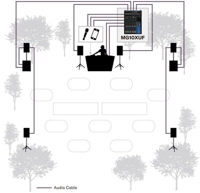 對易於攜帶且好用的PA系統而言,這是個強大的設置,配有足夠輸出功率能播放清晰、有活力的音樂,適合中型戶外派對/DJ活動,聽眾最多可達100人(視座位/場地而定)。