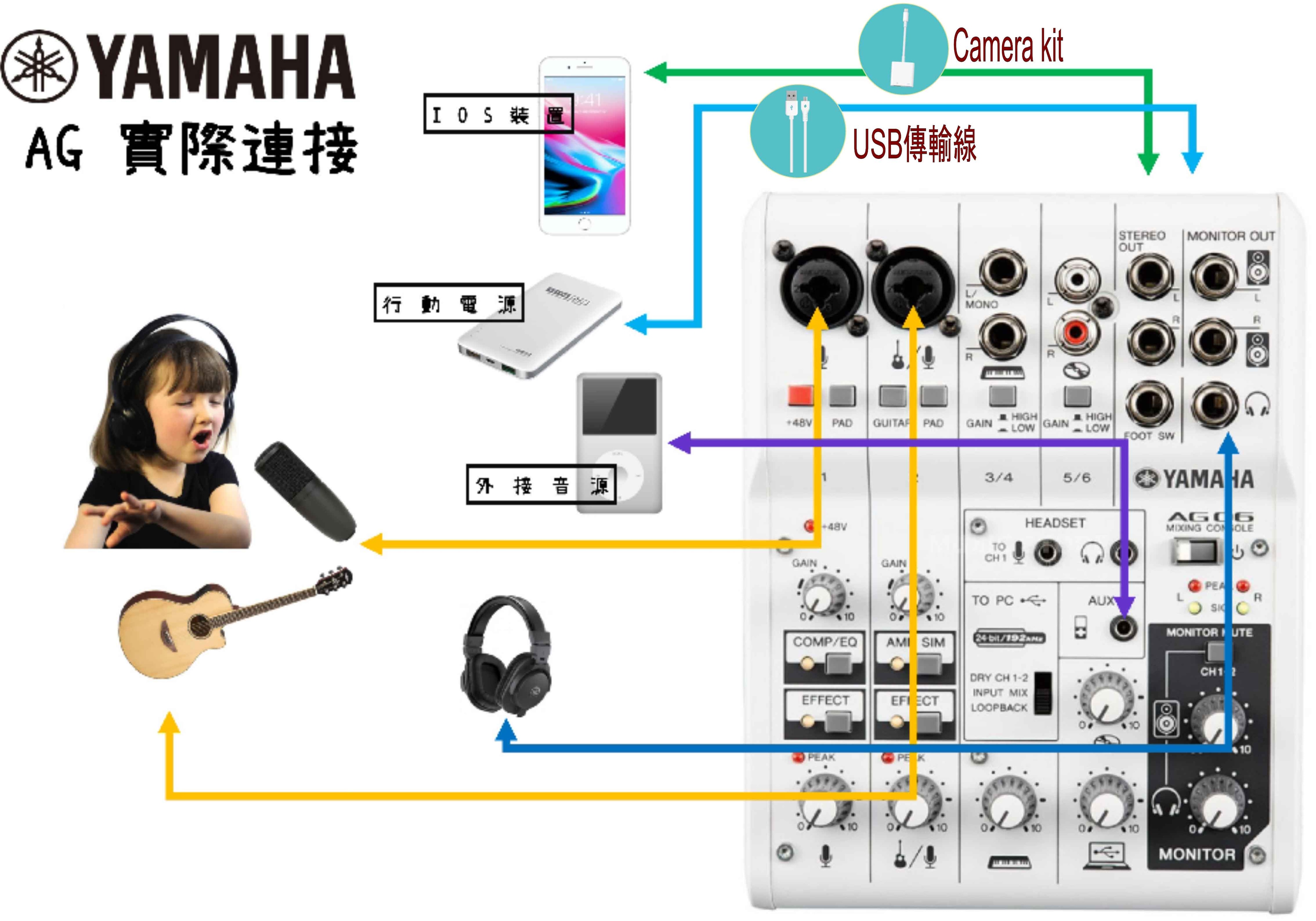 您可以將 AG 系列作為混音器,搭配筆記本電腦和樂器進行個人現場表演。