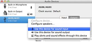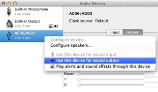 4.以同樣的方式,按住 Control 鍵並按一下清單中的 [AG06/AG03],然後選取 [將此裝置用於聲音輸出]。