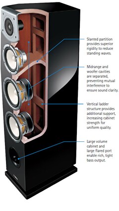 為了創造揚聲器卓越的音效再生能力,音箱的設計是非常重要的。為了減少駐波,以確保最高的準確性,並且提供完整而立體的音效,以達到令人驚嘆的深邃感。其解決方案是採用非平行的表面音箱設計,低音與中音單體部分由一個斜面的隔板分隔,並且透過梯形的支架以強化整個箱體。另一個重點是,箱體的接合採用三面斜接的架構,這也多虧於Yamaha出色的木作技術才得以做到。這項技術確保音箱能夠緊密接合,使其猶如一體,提供綿密有力且準確的低音重現。