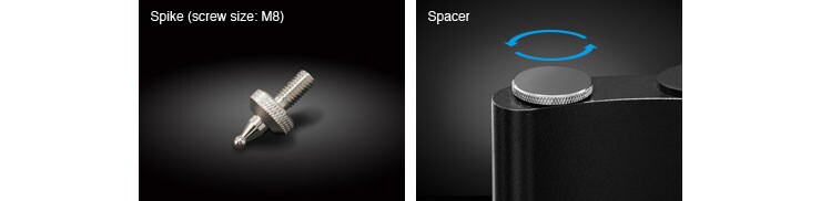 The legs of the SPS-5000 allow for height adjustment, with the included spikes in order to restrict unnecessary vibration of the stand. The spikes can be removed for standing on the rubber legs, to suit the installation location. The stand is also equipped with height adjustment mechanisms (spacers) to prevent unsteadiness of the speaker. Specialised screws to fix the speaker to the stand are included as well.