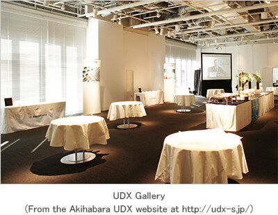 UDX 會議空間是正式的會議室租用空間,而 UDX 藝廊則是大型的活動空間。UDX 會議空間的面積大約為 350 平方公尺,天花板高度為 2.85 公尺。UDX 藝廊的面積為 725 平方公尺,天花板高度約 4 公尺。
