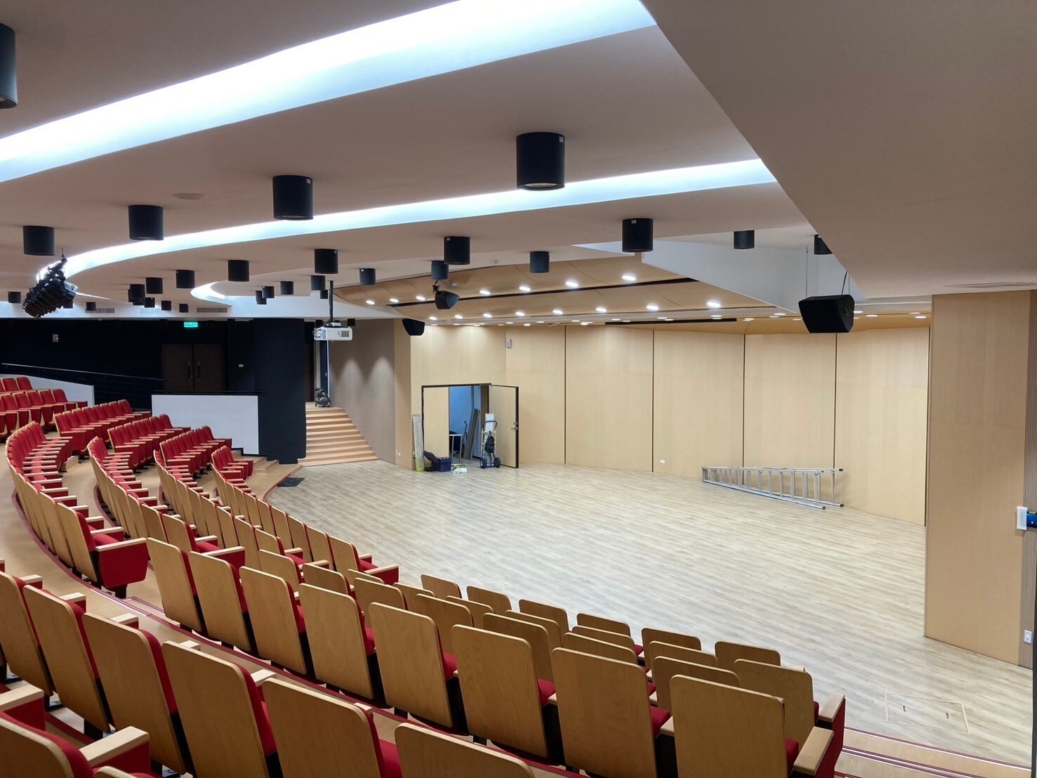主音響系統採用 NEXO P12 點音源被動式喇叭,經過精心配置,確保音樂廳內聲音覆蓋均勻且高保真。舞台監聽則選用 Yamaha VXS8 輔助喇叭,為舞台上的演出者提供乾淨且清晰的聲音。