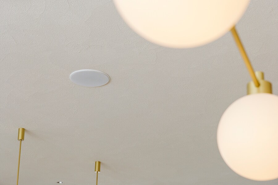 VXC4W 和 VXC2FW 吸頂喇叭的塗漆與室內設計相得益彰,而 VXS10SW 低音喇叭則安裝在天花板後。