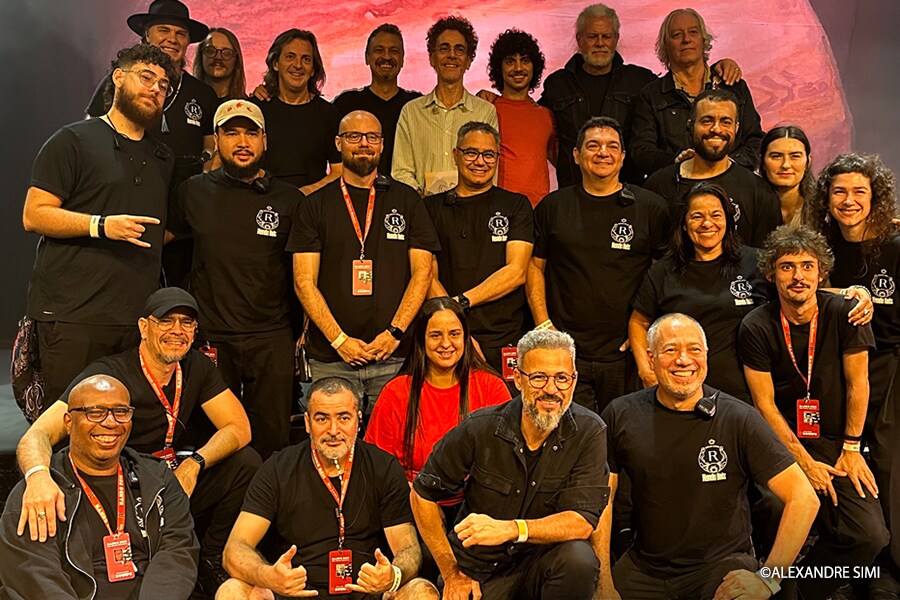 Nando Reis 巡迴演唱會團隊:Nando Reis(後排中)、Alexandre Simi(中排左五)