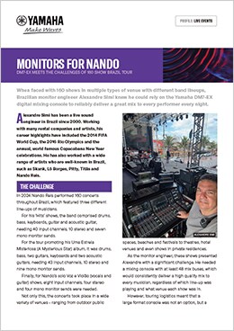 面對 160 場由不同樂隊舉行的多場地、多類型的演出表演時,巴西監聽工程師 Alexandre Simi 知道他可以仰賴 Yamaha DM7-EX 數位混音控台,每晚如期為所有表演者提供可靠出色的混音體驗。