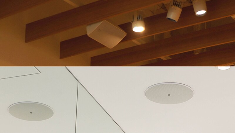 共有吸頂喇叭和壁掛喇叭兩種類型的喇叭,通常安裝於牆壁或天花板上,以在商店和其他商業及服務空間將音樂播放的效果最大化。若在商業空間內安裝家用音響,總是難以滿足商用需求。一般來說,吸頂喇叭可以讓喇叭的外觀不那麼顯眼,而壁掛喇叭則通常用於沒有天花板的場所,或者想讓喇叭成為室內設計中的一部分。針對天花板低的商店,我們建議使用壁掛喇叭,這樣可以更容易地針對特定的目標區域傳遞聲音。針對天花板高的商店,懸掛在天花板上的懸吊式喇叭也很適合。而選擇喇叭時,也要考慮安裝地點的限制,如能滿足空間設計的型號或建築需求。
