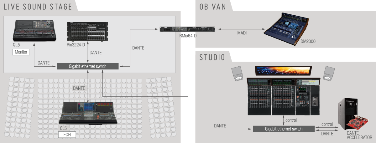 - 根據 Dante 聲音網路、現場廣播,現場直播和製作系統的結合。