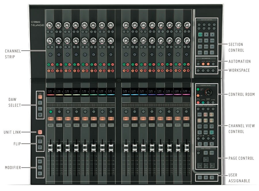 Nuage 介面是由 Nuage Fader 裝置所組成,每個裝置具有 16 組化音器和旋鈕頻道,Nuage Master 裝置包括運輸操作、編輯,監聽等所需的所有控制。這些裝置可以單獨使用,也可以組合配置,以配合不同錄音室的規模和工作流程使用,每個系統最多可配置三個 Nuage Fader 裝置。UNIT LINK 按鈕能讓裝置輕易取消進行雙人操作的連結,然後根據所需再次連結。