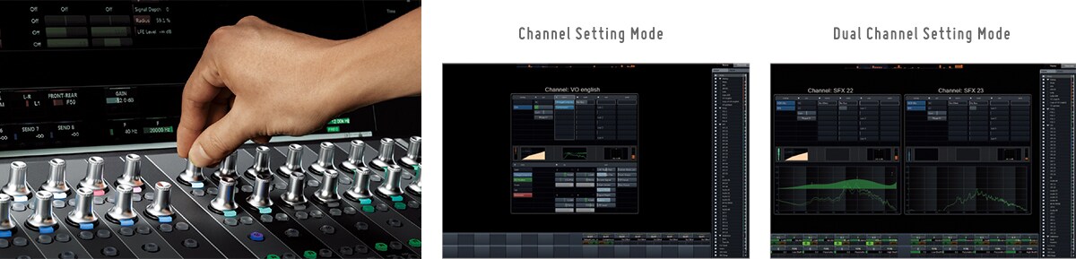 Nuage Fader裝置上的十六個聲道中,每個聲道都有兩個多功能觸控旋鈕。METER、PRE、ROUTING、PAN、SEN、DS、CUE和其他參數可以立即選擇並根據所需進行操作。如想要進行更全面的控制,可以按下聲道[e]按鈕進入聲道設定模式。在該模式下,可透過控制台的所有32個多功能旋鈕直接控制該聲道的參數。另有一個雙聲道設定模式,允許選擇兩個聲道,每個聲道的參數由16個多功能旋鈕來控制。其他功能如三階控制(正常、精準和超精準)以及參數指定旋鈕的fader調節,更加提高靈活性。