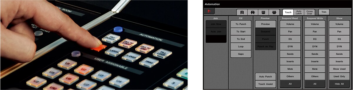 Nuage提供了Nuendo / Cubase自動化面板的完整副本,其中所有自動化設置都可以作為一個群組進行管理,並且可以從Nuage Master裝置的多功能顯示器中進行操作。此外,可以從Nuage控件中選擇自動打孔模式(觸摸、自動閂鎖、交叉)和後期打孔行為(填充至打孔、填充至開始、填充至結束)。當然,每個聲道控制排上都提供了自動化讀取和寫入按鈕,進而增加了系統整體的自動化便利性和靈活性。