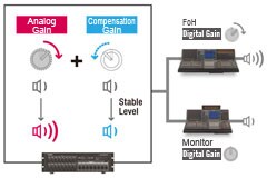 當多台混音座連結到單一I/O機櫃單元的明顯缺點之一是,從一個混音座所做的增益調整可能造成其他混音座發生意料之外的增益改變。CL混音座中實行的增益補償功能可以確保,在從其中一個混音座調整類比增益時,在數位階段會自動應用對應的補償,如此從I/O擴充單元到連接的CL混音座的電平(level)會維持不變。