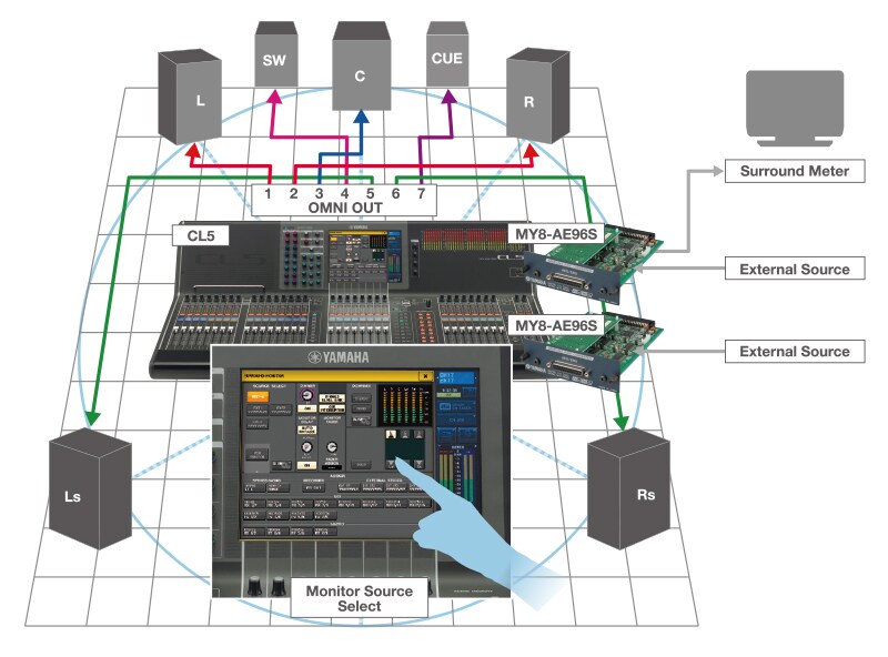對於需要大量的輸入頻道應用,CL混音座可透過I/O卡進行串接連接,例如將MY16-AE安裝在Mini-YGDAI擴充卡槽。