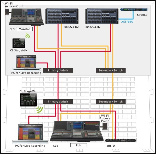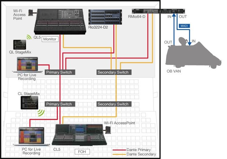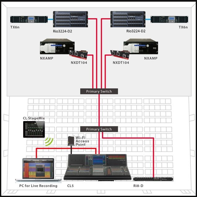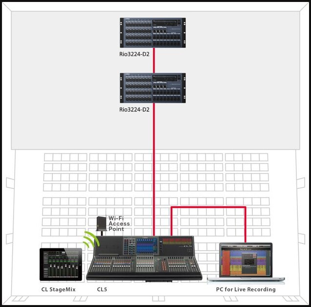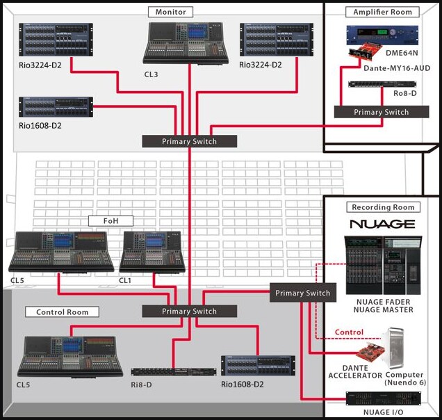 A Nuage Advanced Production System can be merged into a live sound system based on CL Series consoles and Rio Series I/O units via Dante. This makes it possible to provide a fully integrated network audio system that can handle both live sound and production in halls or theaters that have on-site recording rooms, for example. Since automatic gain compensation can be applied when Rio Series I/O units are used with CL Series consoles, analog gain adjustments in multiple CL consoles connected to a common Rio unit will not cause unwanted changes in overall level.