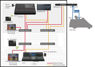 Internal port switches allow the CL consoles to be easily set up for daisy-chain or star network configurations. In this example the Console at FOH position is directly connected to the I/O rack at the side of the stage. The network is self-configured. Of course the CL StageMix iPad app can be used even in simple systems like this one, and Dante Virtual Soundcard can be used to enable multitrack recording to a DAW such as Steinberg’s Nuendo.