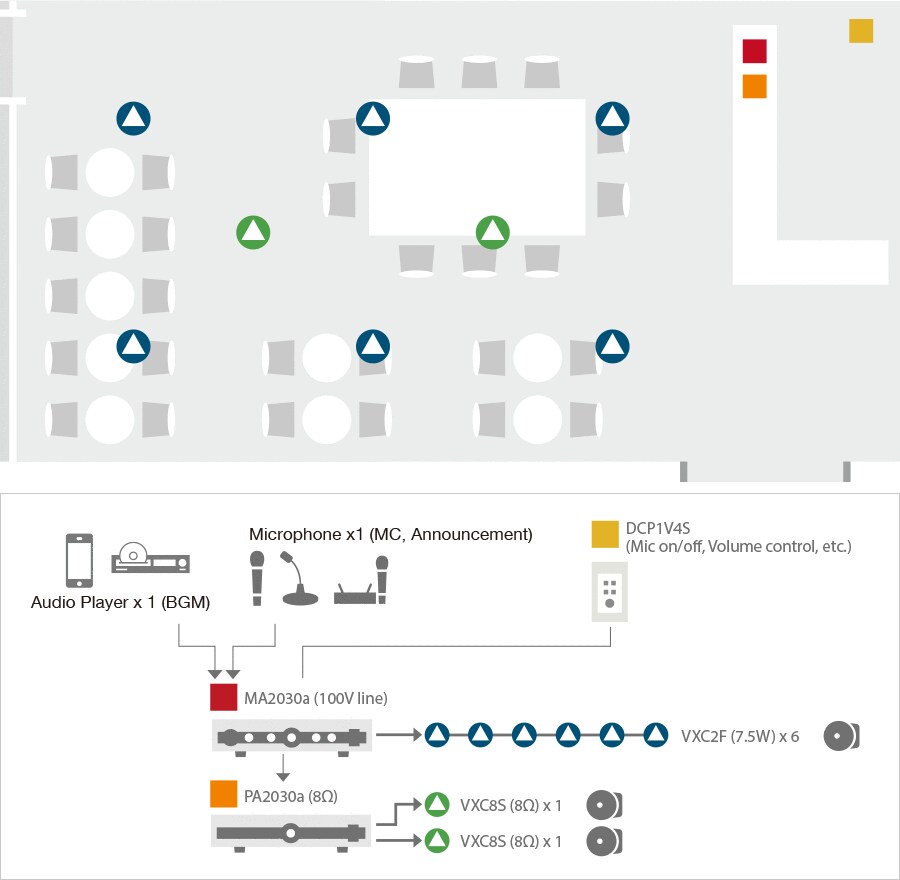 使用VXC2F喇叭和混音台擴大機MA2030a,可以打造出簡潔的高效能系統,可在播放背景音樂時使用麥克風。增加功率擴大機PA2030a和吸頂低音喇叭 VXC8S,以打造更沉浸的氛圍。
