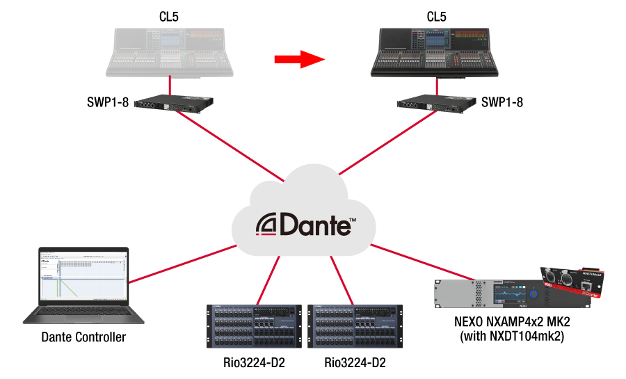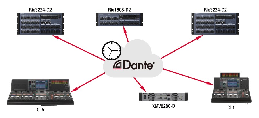 整個 Dante 網路可作為時脈主要裝置,所以不需要思考網路中的主/從關係。