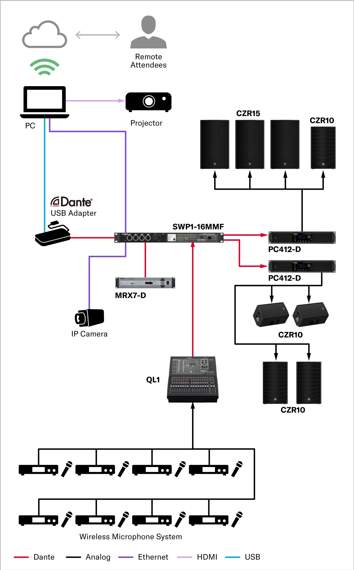 另一個適用于大型PA和遠端分發的系統。Yamaha提供了豐富的Dante相容設備系列,這些設備能夠改善設置時間,並減少基於數位混音器結合各種點源和線陣列喇叭的佈線。搭配使用我們專門的ProVisionaire系列軟體的定制控制器,系統的設置和操作可以大大簡化,讓您能夠更輕鬆地為舞臺和遠端參與者提供清晰、一致的音訊。