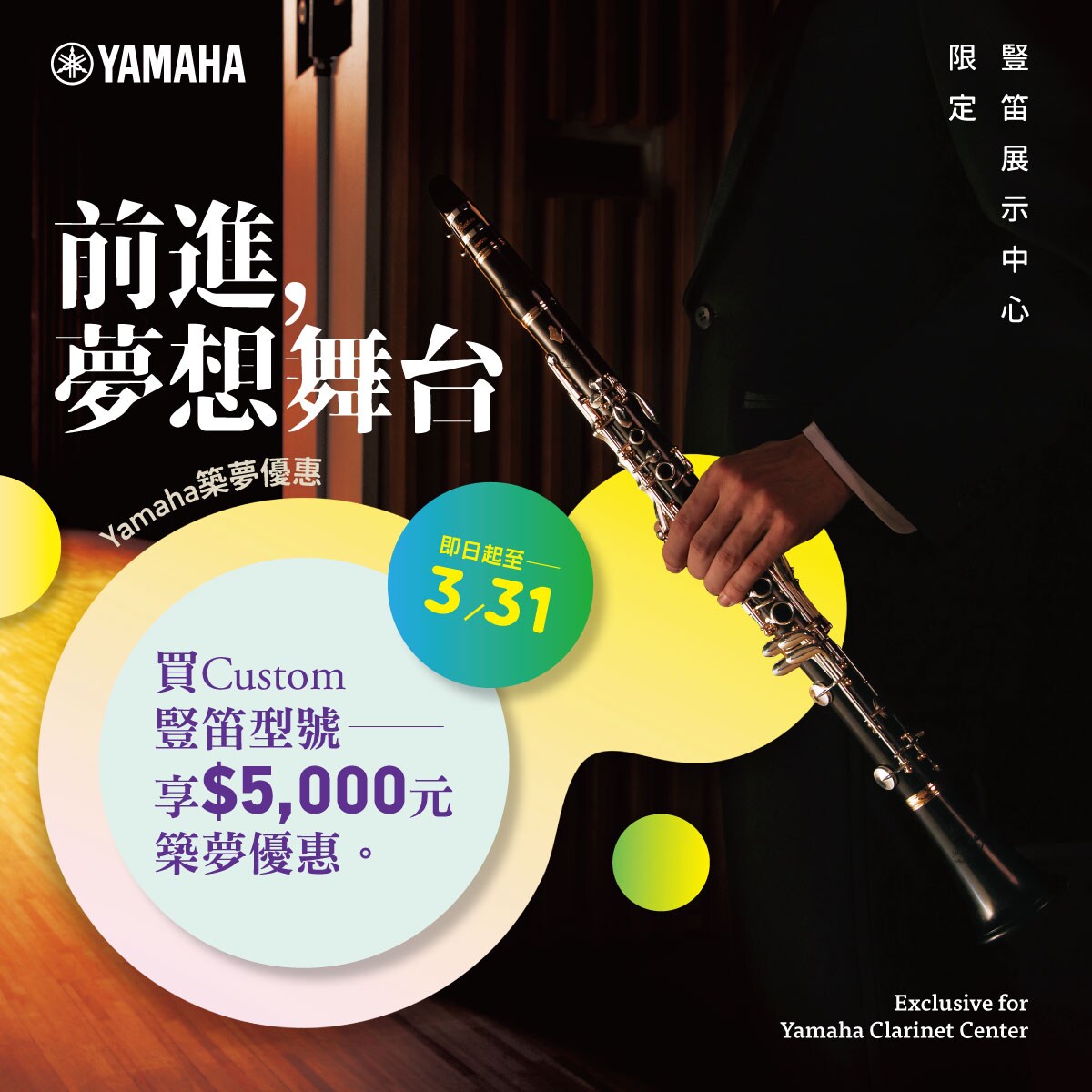 於活動期間內,至Yamaha豎笛展示中心,購買下列客製級豎笛型號,即可享有$5,000的築夢優惠折扣!