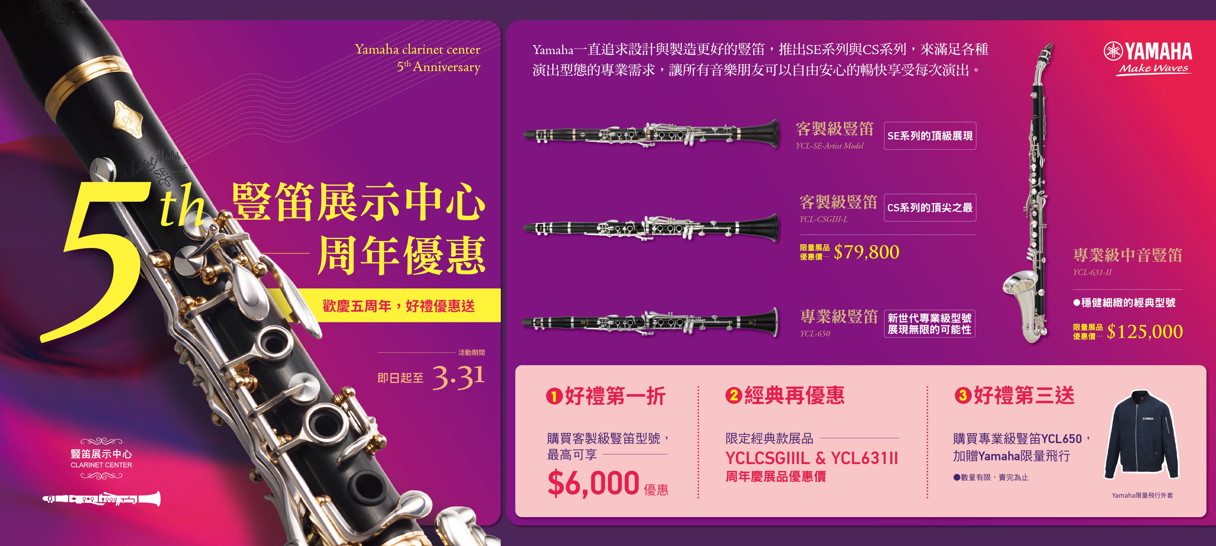 購買專業級豎笛指定型號 YCL-650,加贈 Yamaha限量飛行外套(數量有限,送完為止)