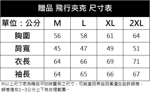 贈品品牌飛行夾克尺寸參考表