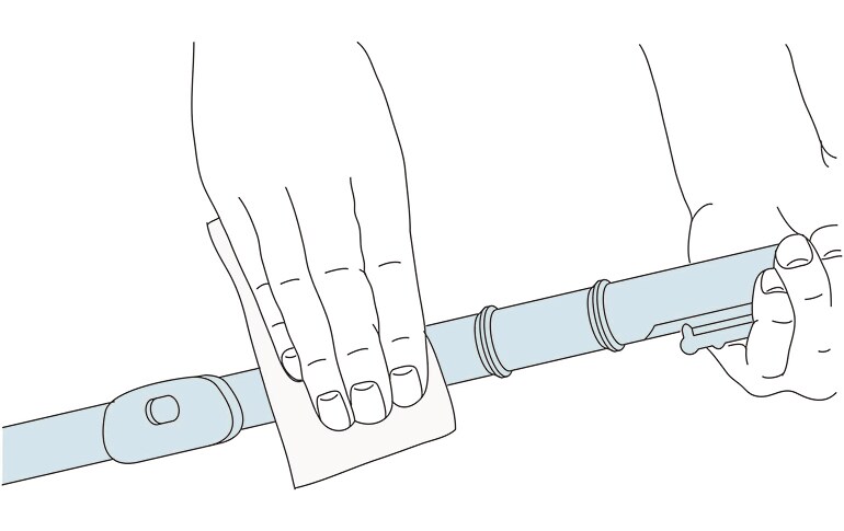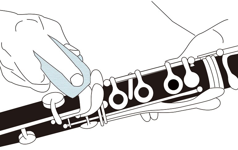 將少量清潔蠟滴在清潔紗布或擦拭布上後,以擦拭的方式來進行樂器表面清潔。