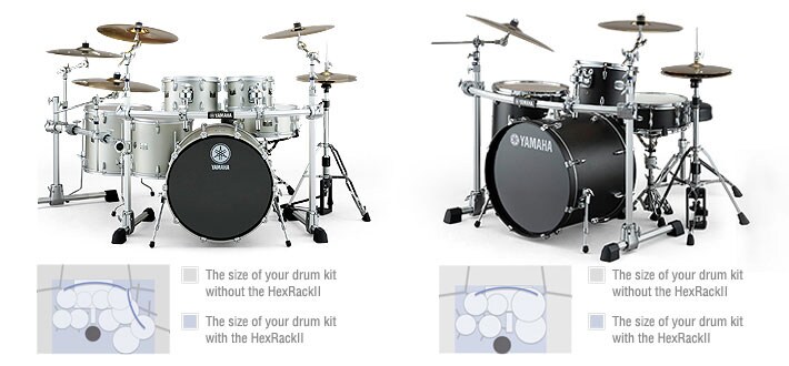 基礎的 HEXRACKII 套組由兩隻腳組成,完全兼容 Yamaha 系統硬體。與典型的硬體設置相較,HEXRACKII 佔用更少空間,減少鼓組周邊因為架腳等等造成的地板雜聲。該系統的套管和支架為鋁製,使得重量更輕、更易於運送和安裝。伴隨多種可選夾具,此鼓架系統具有極大的可擴張性。