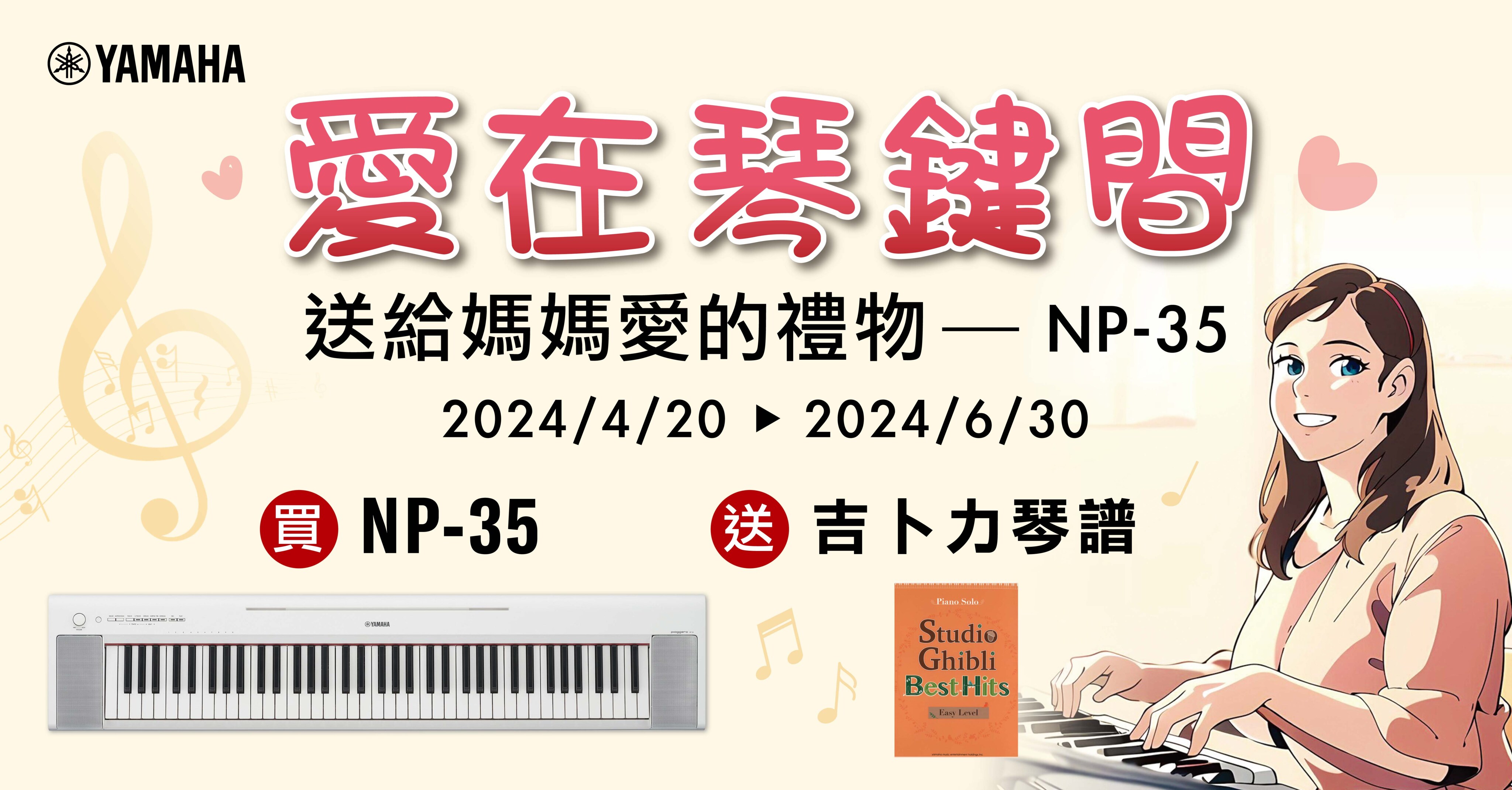1. 百貨、Yamaha蝦皮官方商城:活動期間至百貨與Yamaha蝦皮官方商城購買Yamaha NP-35,隨琴贈送限量吉卜力琴譜。