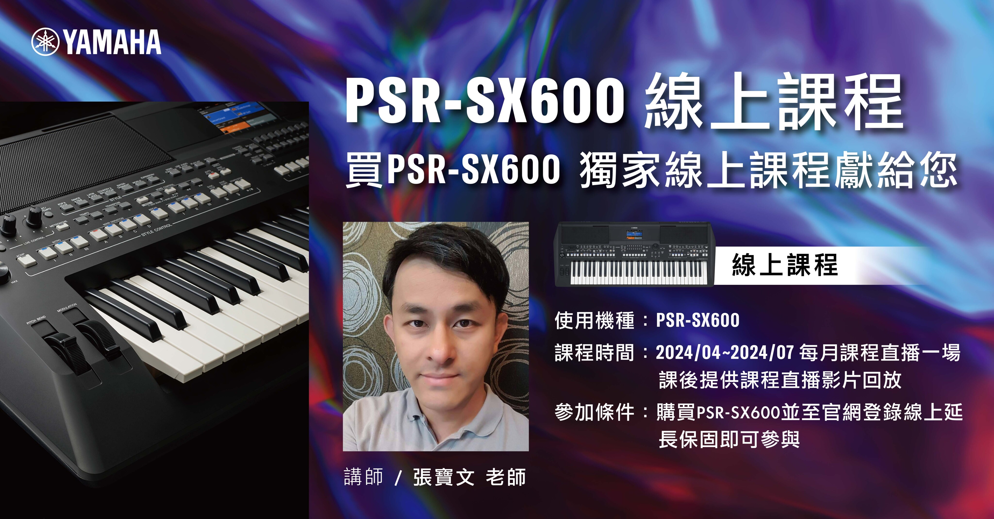 即日起,只要購買PSR-SX600並完成線上保固登錄,即可於2024/04~2024/07每月參與張寶文老師的線上課程一場,課後也將提供課程影片供複習和回放!