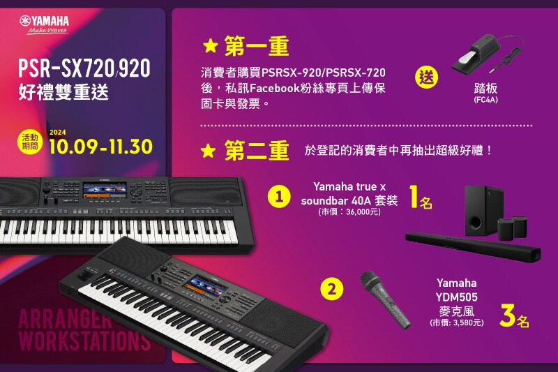 聽完上述精彩的功能介紹,想必各位鍵盤手都很心動吧!現在PSR-SX920/720有超級優惠的新品上市活動!於2024/10/9~2024/11/30,凡購買PSR-SX720/920,即贈Yamaha FC4A 高級踏板!甚至還會從有購買的人中抽選一名幸運兒得到Yamaha TRUE X Soundbar 40套裝 (市價NT36,000),以及三名得到Yamaha YDM505動圈麥克風 (市價NT3,580)!把握機會趕快出手吧!