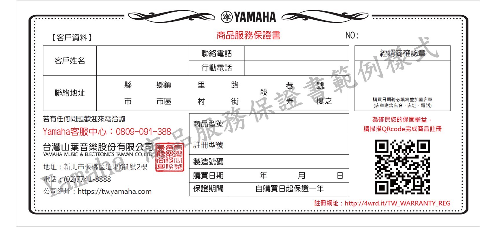 *Yamaha商品服務保證書範例樣式