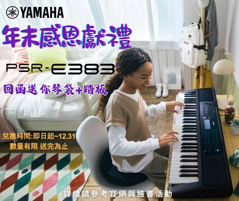 Yamaha電子琴年末感恩獻禮!買PSR-E383回函送你琴袋+踏板!