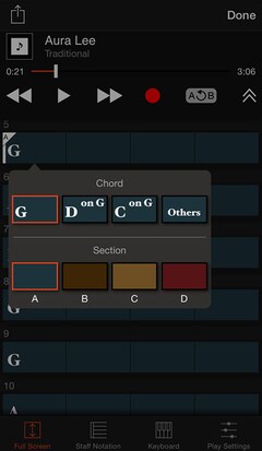 根據您的練習及演奏以調整節奏及調性,您甚至可以依據推薦之兩組和弦或選擇和弦跟音及型態,來編輯和弦以打造自己的獨家編曲,使用預播按鈕可以試奏您新的和弦編曲!